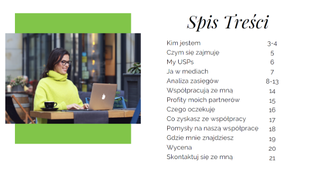 Załączone poniżej zdjęcia to sneak peek prezentacji promocyjnej w naszym wykonaniu. Karolina zleciła nam przygotowanie materiałów podsumowujących jej aktywność w social mediach, oczekiwania względem współprac oraz wartość jaką może zaoferować potencjalnym firmom zainteresowanym współpracą.